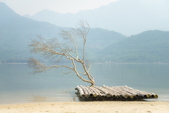 Wooden stump or timber in water lake or lagoon with silence foogy environment and fresh air in the morning. Natural view of abstract photo concept.  Applied with blue highlight for cold feeling.