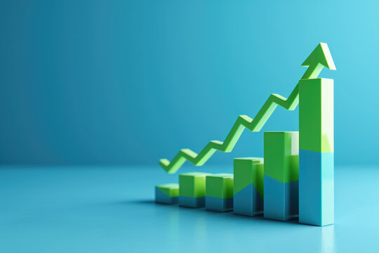 Glossy 3D-rendered blue bar chart, upward trend. Financial growth and achievement. Close-up.