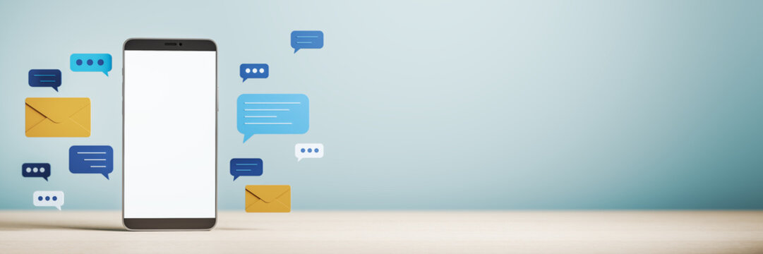 Smartphone with blank display surrounded by colorful speech bubbles and message icons on wooden surface and light blue gradient background. 3D Rendering