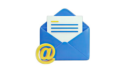 White envelope with blue at symbol signifies email and digital messaging. Modern concept for online communication. Network correspondence, virtual mail, cyber correspondence.