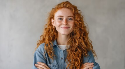 Stylish redhead woman in denim jacket outdoors
