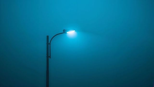 Solitary street lamp glowing through teal fog, minimalist night scene with soft halo light