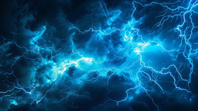 Electric blue lightning bolt overlay the dark background, representing energy, power, and natural force.