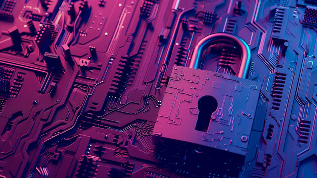 Blue circular cybersecurity hud with lock icon and circuit connectivity for data protection