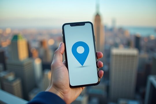 Person's hand holding smartphone with blue map pin pointer against city skyline.