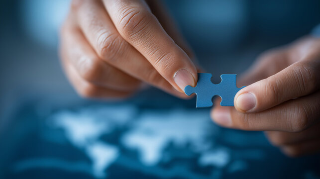 Overhead shot of blue map pieces, location pin, server, and chip on a white surface