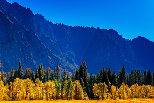 Golden yellow field and trees with green trees and blue mountain beyond under the blue sky.