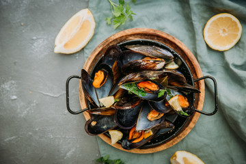 Traditional blue mussel in white wine on stone background, top vie, copy space
