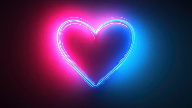 Neon heart with a glow on the background of a dark brick wall. Neon sign pink and blue.