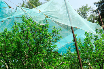 Blue netting covering young apple trees in the orchards of Shimla. These plants produce some of the best organic fruit in the world