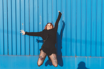 Woman in front of blue wall jumping in mid air