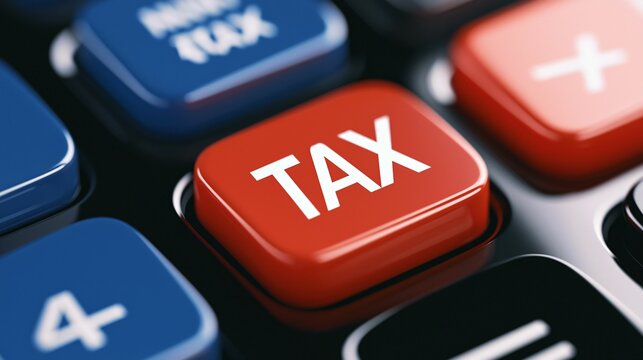 Concept of tax icon, financial and money savings. Red tax button on a calculator with blue numeric keys.