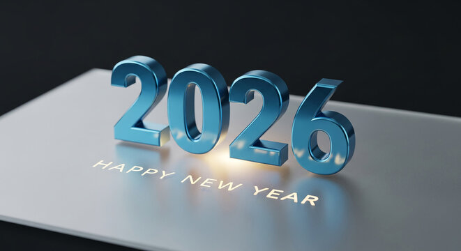 Metallic blue number 2026 and text "Happy New Year" on gray surface against dark background, representing celebration, future anticipation