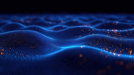 undulating blue particle mesh with scattered orange glowing dots over a dark background, serene futuristic digital landscape evoking wonder