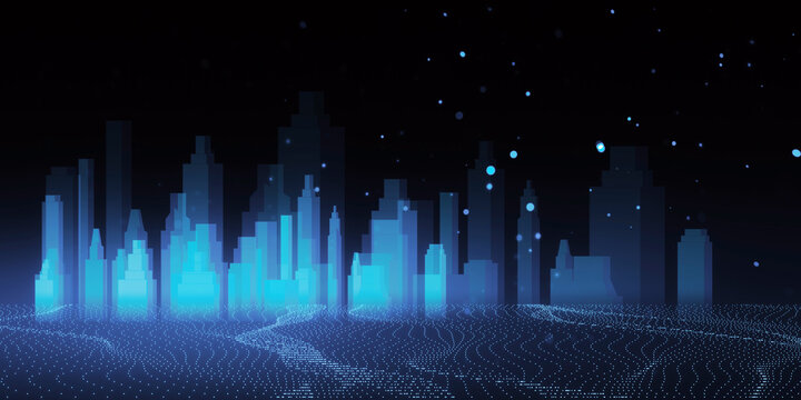 A digital concept of a smart city skyline over a network grid with floating particles, depicted in blue tones against a dark background. 3D Rendering