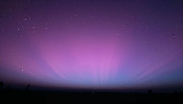Vibrant purple and blue aurora rays radiating across starry sky over silhouetted plains