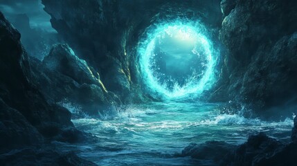 A glowing blue portal surrounded by rocky terrain, creating a mystical and otherworldly atmosphere.