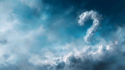 A question mark formed by soft white clouds against a dynamic blue sky symbolizing mystery inquiry and the unknown