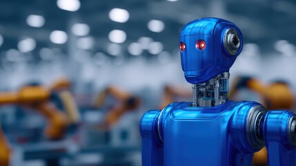 A futuristic blue robot stands in a factory setting, featuring glowing red eyes and advanced technology, surrounded by industrial robotic arms.