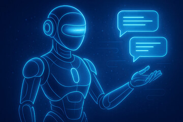 Futuristic blue robot head with glowing eyes and ai text on a dark background
