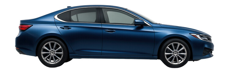 Blue sedan car side view  on transparent background, PNG