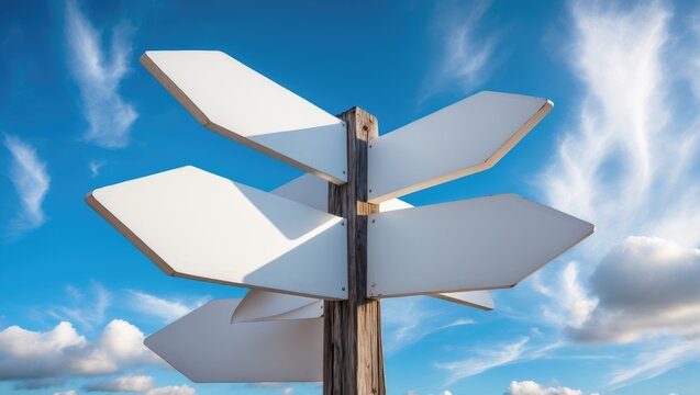 Wooden signpost with arrows pointing towards support, advice, and guidance against a clear blue sky with clouds.