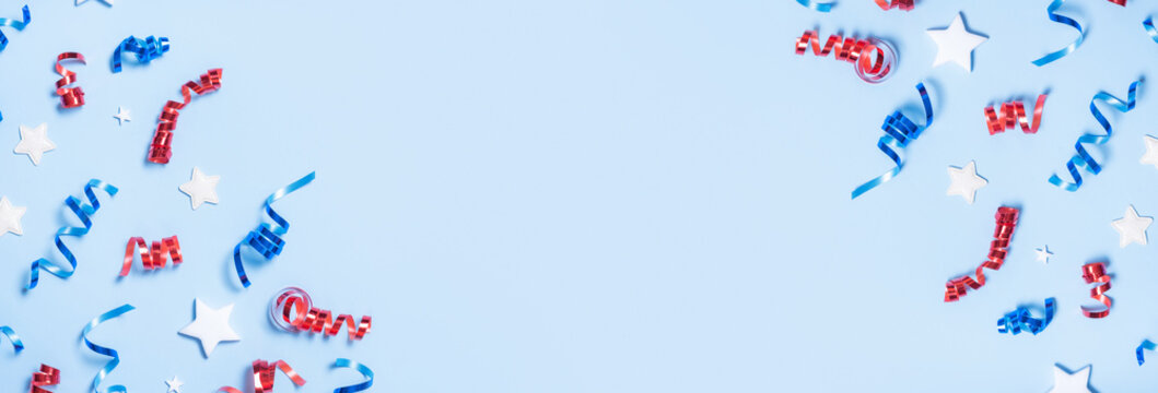 USA Independence day concept Red and blue spirals and white stars elements of USA flag top view flat lay on blue background