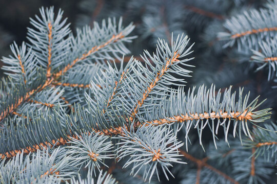 Blue spruce needles close up, macro.Selective focus. Blue pine background.