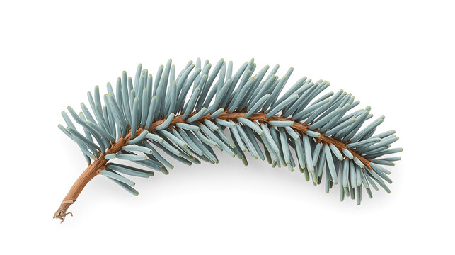 A highly detailed close-up of a blue spruce branch showcases its soft blue-green needles, fine texture, and subtle color variations against a pure white background. The branch features a thin brown st