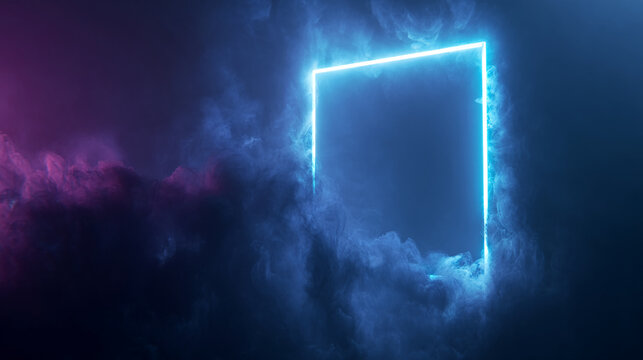Neon blue square frame in smoky purple-blue environment, showcasing blank space ideal for text or logo placement. Represents mystery, technology, or futuristic concepts