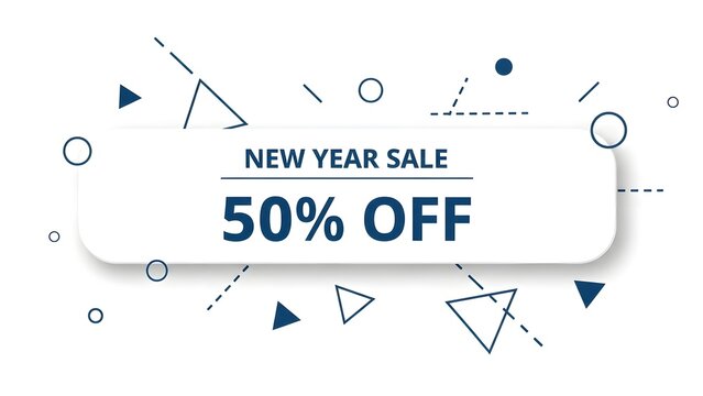 New year sale banner with 50 percent off discount in blue text and geometric shapes on white background