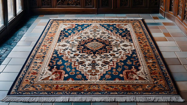 Colorful Persian rug with intricate traditional design blue tones and geometric patterns plush texture elegant home decor statement piece