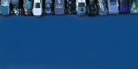 Horizontal blue banner with number of different blue toy models of cars,racing cars and SUVs in upper border of frame,top view,selective focus.Advertising poster and design for web-site.Copy space