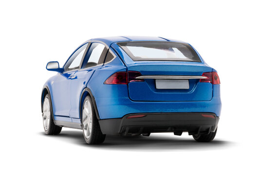Blue colored modern electric toy car studio photo showcasing left side and rear view.