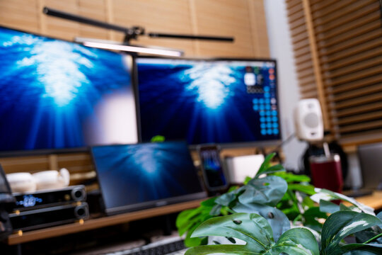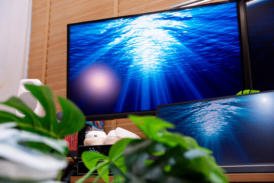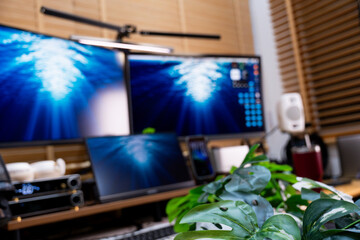 A detailed view of a modern and organized workspace, showcasing dual monitors displaying dynamic blue visuals, complemented by indoor plants and a collection of mechanical keyboards.