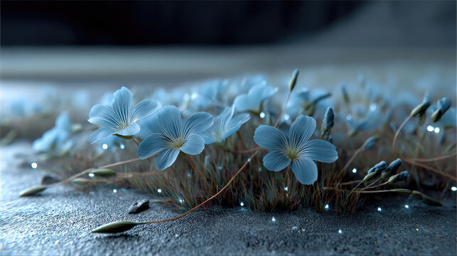 Delicate blue wildflower bloom on frosty meadow, sparkling ice crystals and soft glowing light create magical, tranquil atmosphere