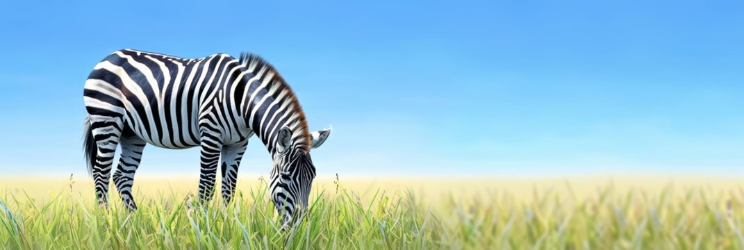 A zebra grazing in a wide-open grassy field under a clear blue sky, showcasing the beauty of African wildlife in its natural habitat.