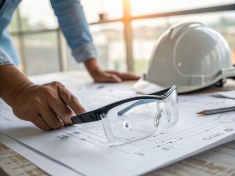 Engineer reaching for safety glasses on blueprint office environment closeup image soft daylight shallow depth of field
