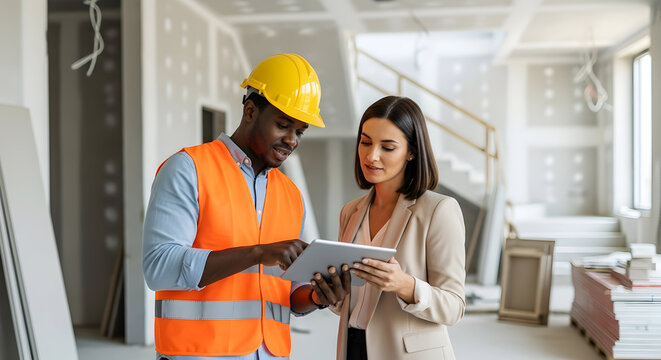 Construction worker and client reviewing plans together on a tablet at a building site, ensuring project success and collaboration.