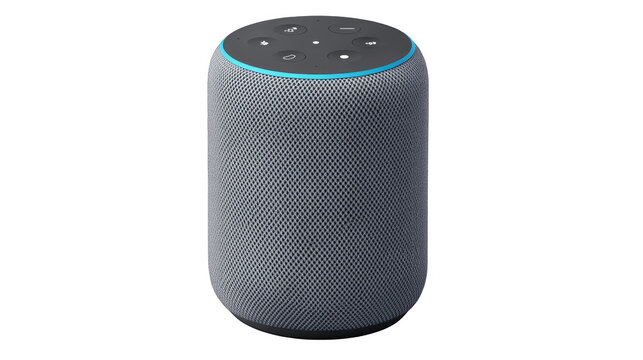 Multiple smart speakers placed around a modern home, creating a seamless and connected smart home experience, with a focus on design and technology