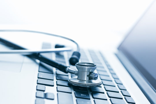 closeup view of stethoscope report on laptop keyboard. bluish tint.