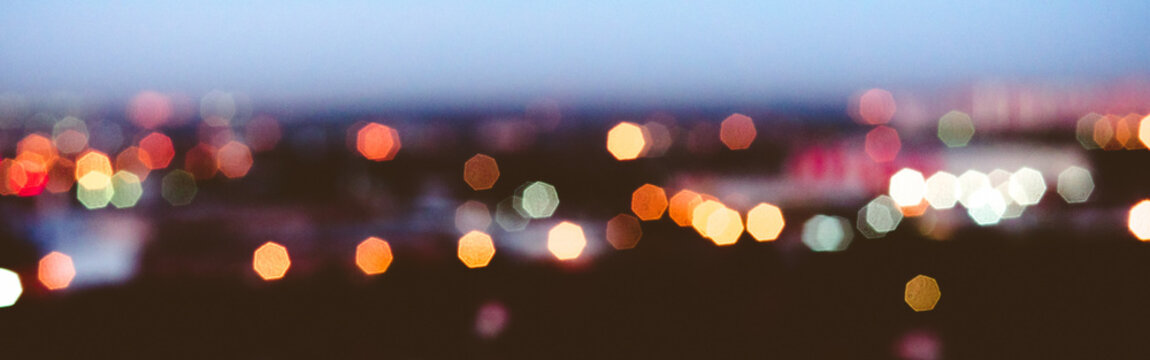 Blur light flare. Bokeh neon glow. Futuristic radiance. Defocused ultraviolet navy blue pink purple color flecks glare on dark modern abstract background.