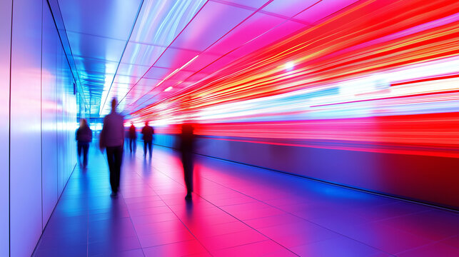 Abstract urban scene with motion blur of people and red and blue lights, creating a dynamic city nightlife atmosphere.
