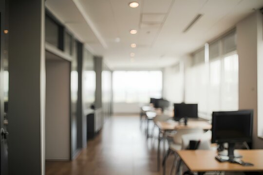 Beautiful blurred background of a light modern office interior with panoramic windows and beautiful lighting