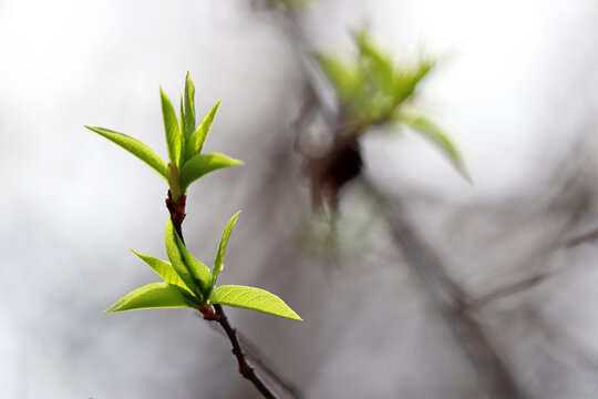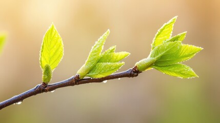 Fresh green leaves with raindrops on a tree branch showcasing new growth and empty space for text on a soft blurred background