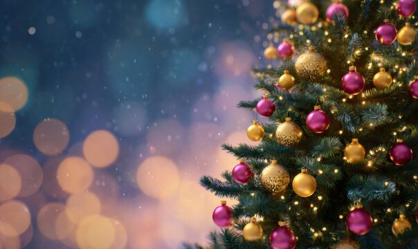 Decorated christmas tree with red and gold ornaments, wrapped presents underneath and falling snow against a blurred background with bokeh effect, creating a magical christmas atmosphere. Copy space
