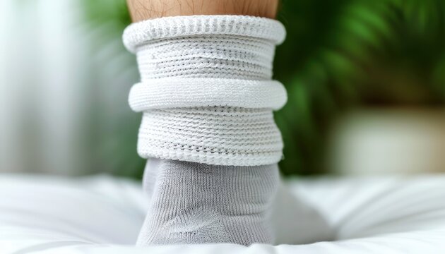 Close-up of a person wearing white socks, highlighting the cozy and comfortable knitted fabric, set against a blurred background.