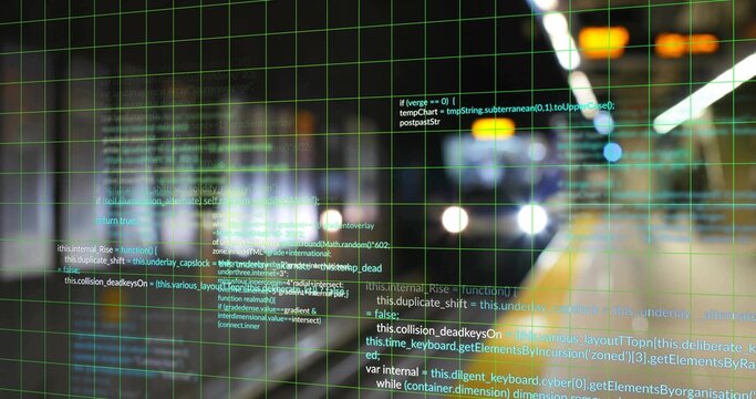 Neon candlestick trading chart with green grid and code overlay for fintech ui