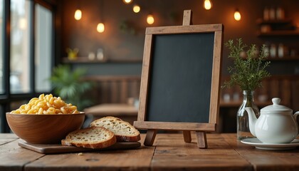 A rustic wooden table displays a basket of freshly baked pastries, against a blurred background of a bustling, modern bakery.
