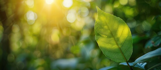 Green leaf on a blurred greenery background in a garden with sunlight, perfect for a copy space image with a natural green plants landscape, reflecting ecology and a fresh wallpaper concept.